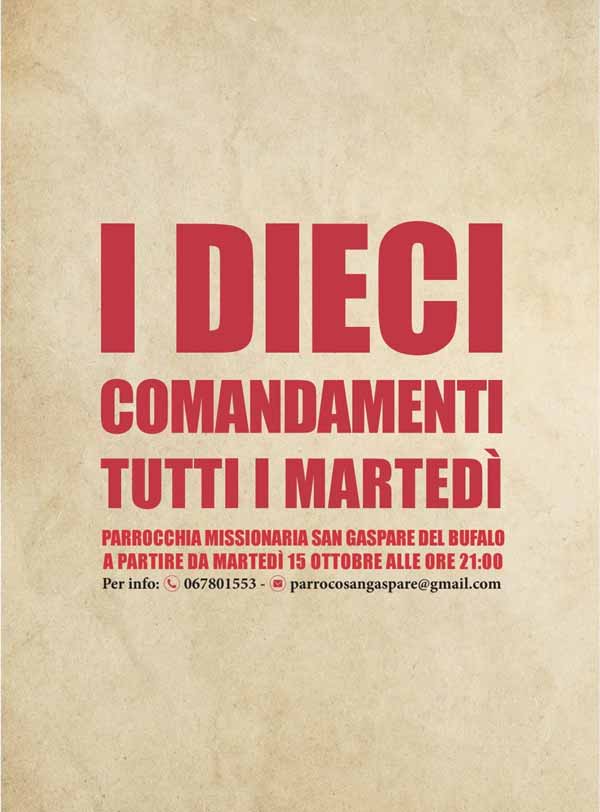 I Dieci ComandamentiDi Parrocchia San Gaspare / 15/10/2024 I Dieci Comandamenti. Tutti i martedì alle ore 21:00 a partire dal 15 ottobre.Vi aspettiamo tutti!!! Contattitel: 067801553mail: parrocosangaspare@gmail.com